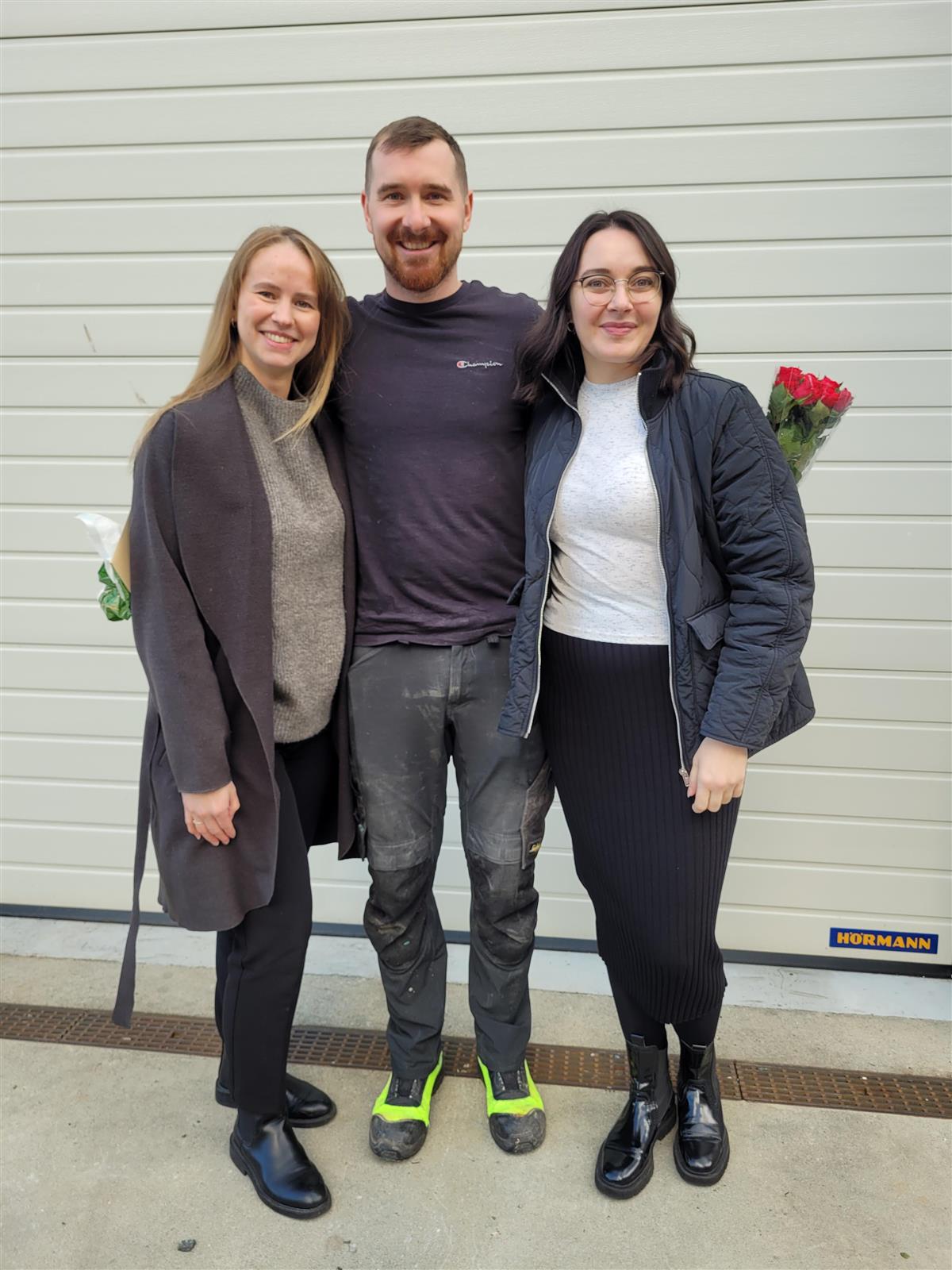 Lisa og Iryna frå flyktningtenesta saman med Yaroslav Yarovenko- Yaroslav Yarovenko, kom til Fjord i slutten av 2023, fast arbeid ved Norinsekt i Stordal.