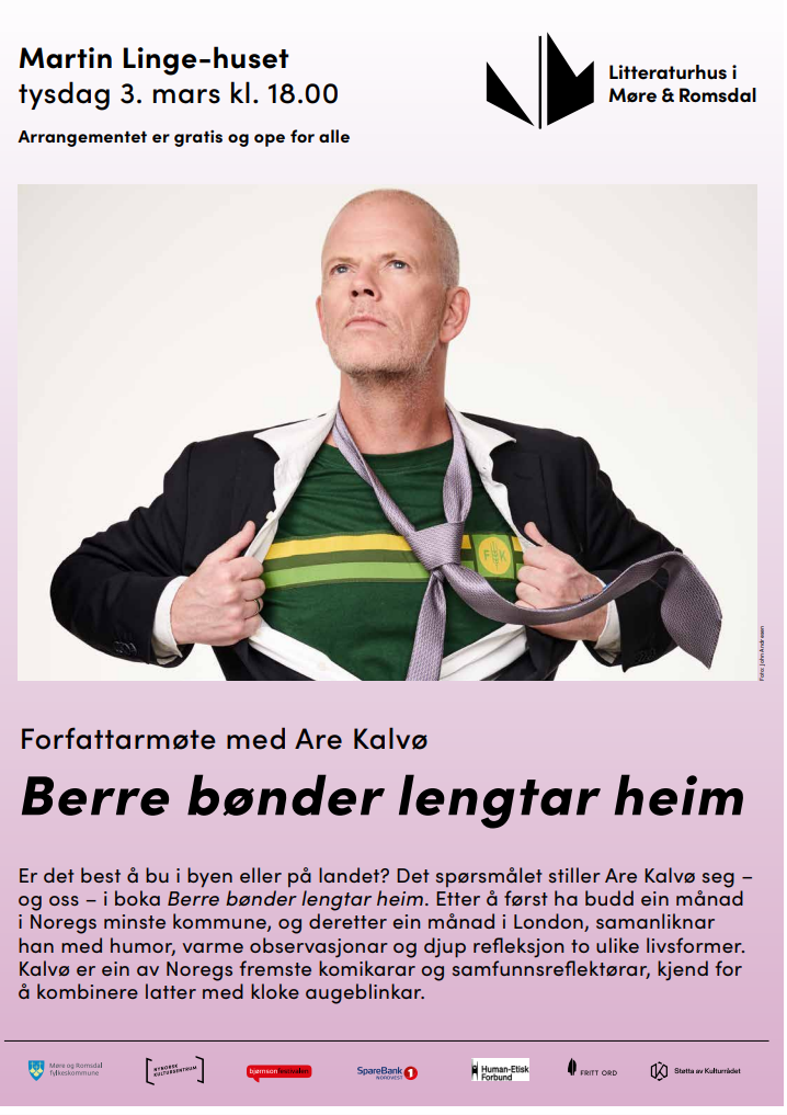Berre bønder lengtar heimLytt til tekstenStopp avspillingVelkomen til forfattarmøte med Are Kalvø på Martin Linge-huset tysdag 3. mars klokka 18. Arrangementet er gratis og ope for alle.Er det best å bu i byen eller på landet? Det spørsmålet stiller Are Kalvø seg – og oss – i boka Berre bønder lengtar heim. Etter å først ha budd ein månad i Noregs minste kommune, og deretter ein månad i London, samanliknar han med humor, varme observasjonar og djup refleksjon to ulike livsformer. Kalvø er ein av Noregs fremste komikarar og samfunnsreflektørar, kjent for å kombinere latter med kloke augeblinkar.Gratis og ope for alleStad: Martin Linge huset i ValldalTid: Tysdag 3. mars klokka 18Det vert sal av bøker. Arrangementet er ved Litteraturhus i Møre og Romsdal i samarbeid med Fjord bibliotek. Publisert 24.02.2026 09.01 Sist endra 24.02.2026 11.12