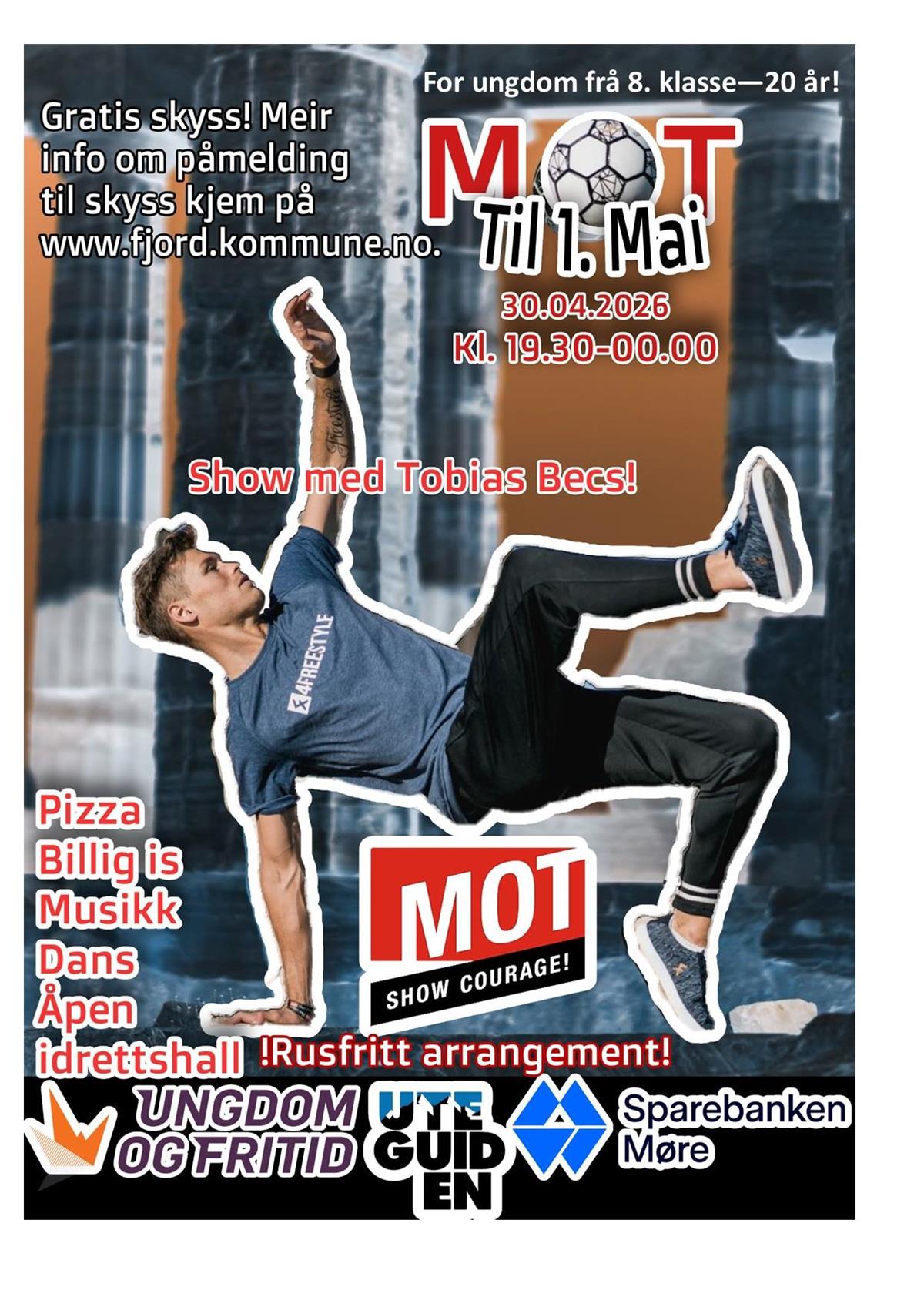 Vi inviterer ungdom frå 8. klasse - 20 år til rusfritt arrangement på Martin Linge-huset i Valldal torsdag 30. april. Fotball-freestyler Tobias Becs kjem, i tillegg blir det open hall, musikk og dans!