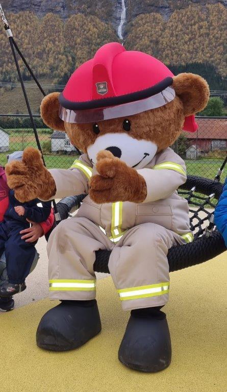 Maskoten Bjørnis på på besøk i barnehagen