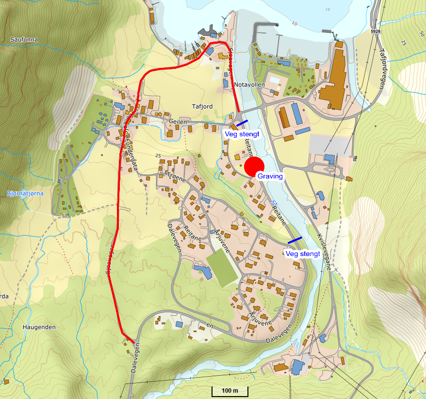 Den kommunale vegen ved Reitane i Tafjord vert peridevis stengt for gjennomkøyring tysdag 21. og onsdag 22. oktober. Vegen vert stengt på grunn av gravearbeid for vassledning. Omkøyring via Sjoavegen.