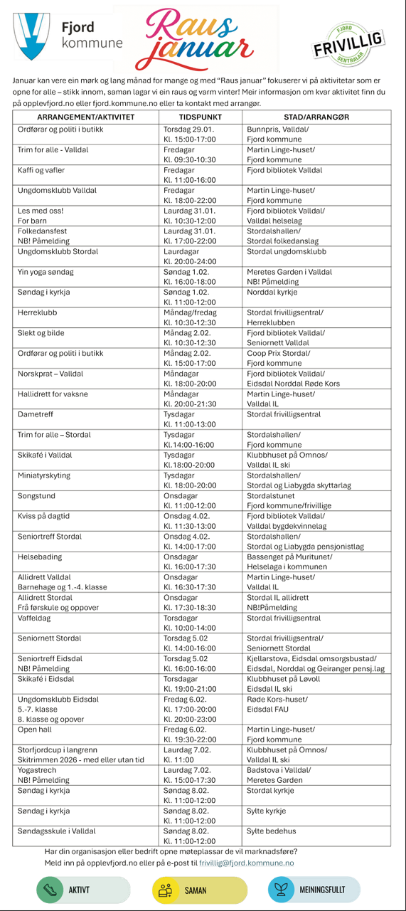 Aktivitetar i Fjord i januar, jf. aktivitetskalenderen.