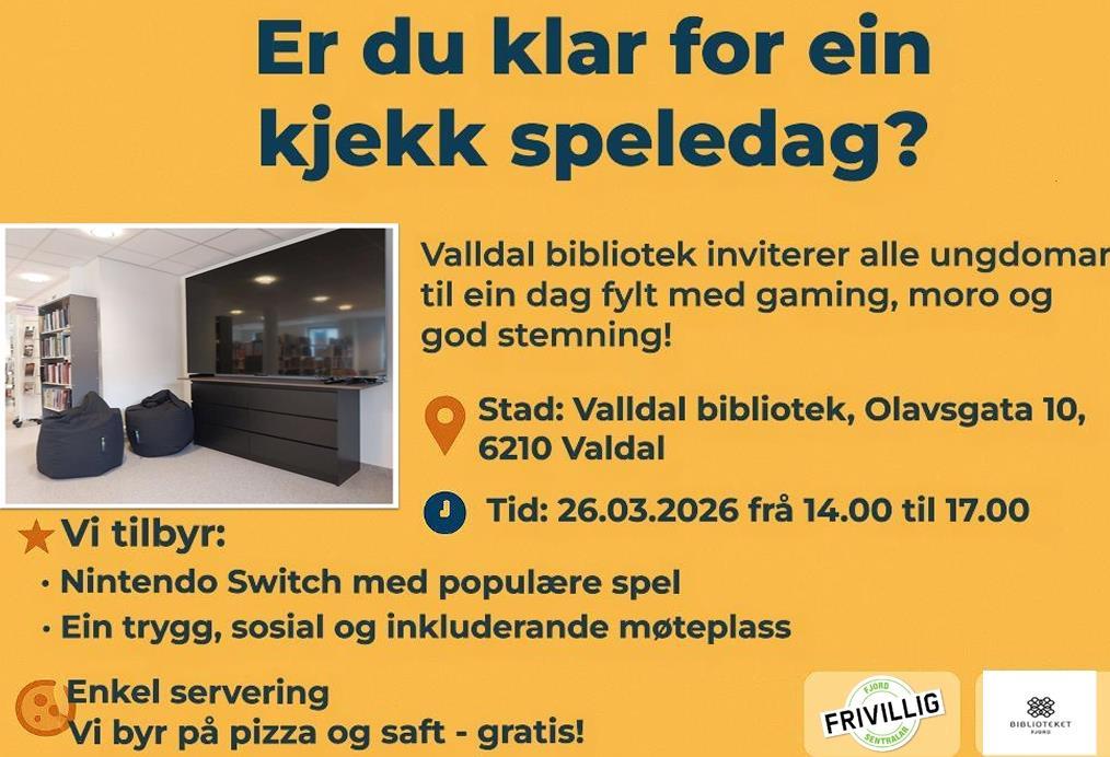 Biblioteket inviterer ungdommar i 7. - 10. klasse til ein speledag torsdag 26. mars etter skuletid. Det blir gaming eller brettspel, pizza og god stemning.
